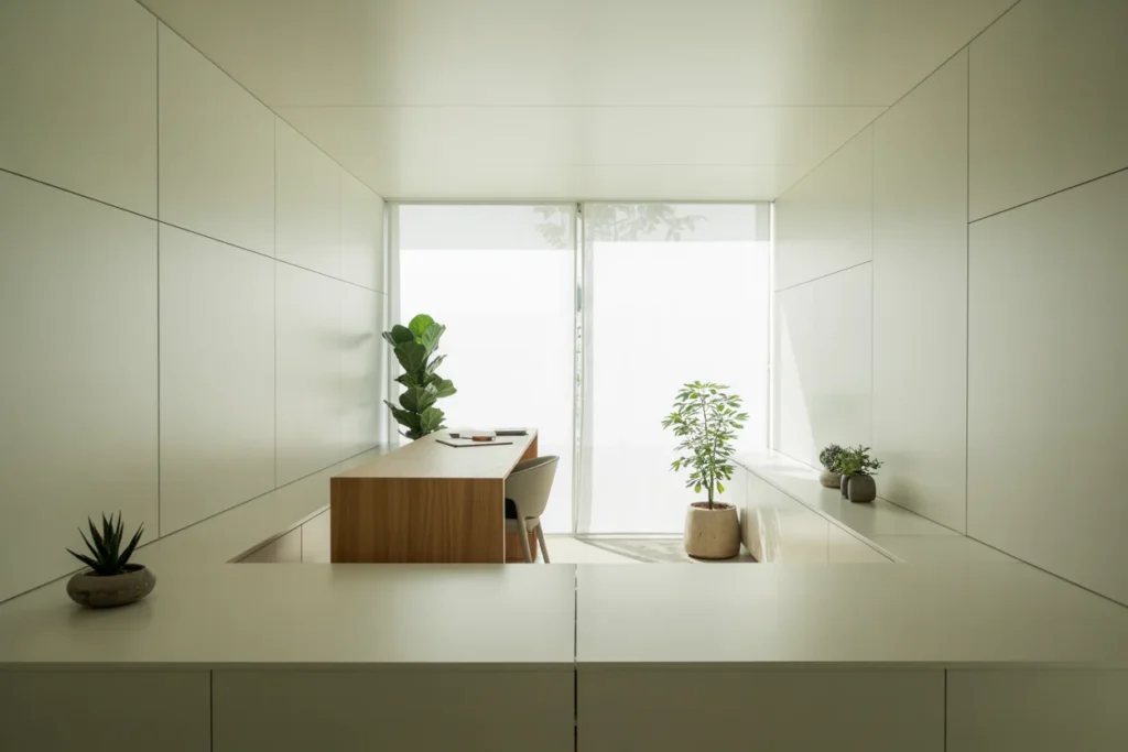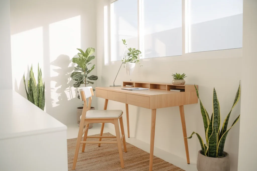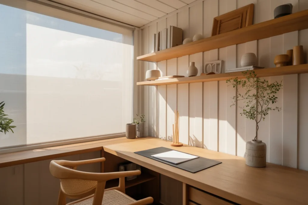 Japandi design blends Japanese minimalism with Scandinavian warmth. Neutral colors, simple furniture, and natural textures create a balanced workspace.