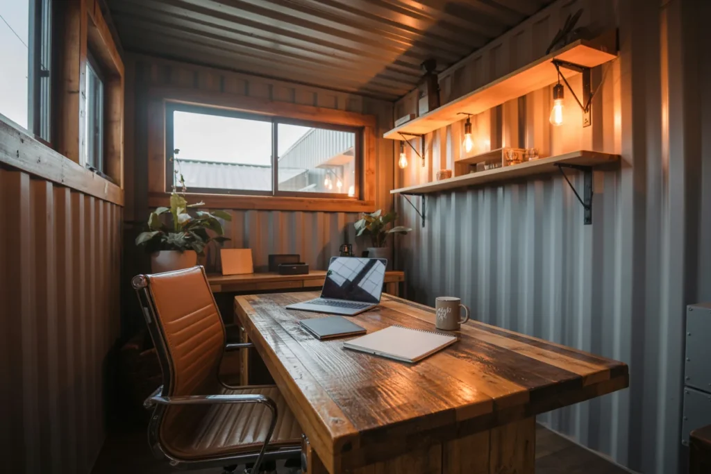 Rustic design adds warmth and character to container interiors. Reclaimed wood desks, vintage lighting, and warm textures create a charming workspace.