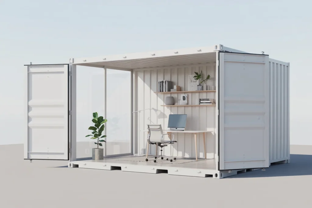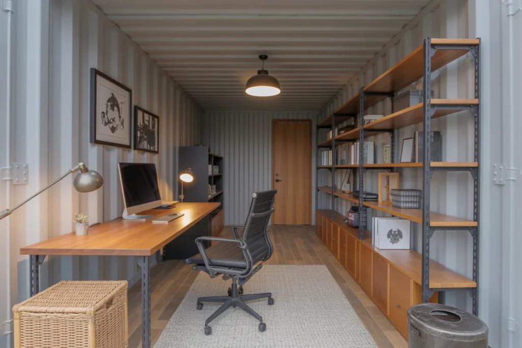 Adding a comfortable lounge chair or stylish bookshelf can make the office feel like a high-end studio. Luxury details transform a simple container space into a sophisticated professional environment.