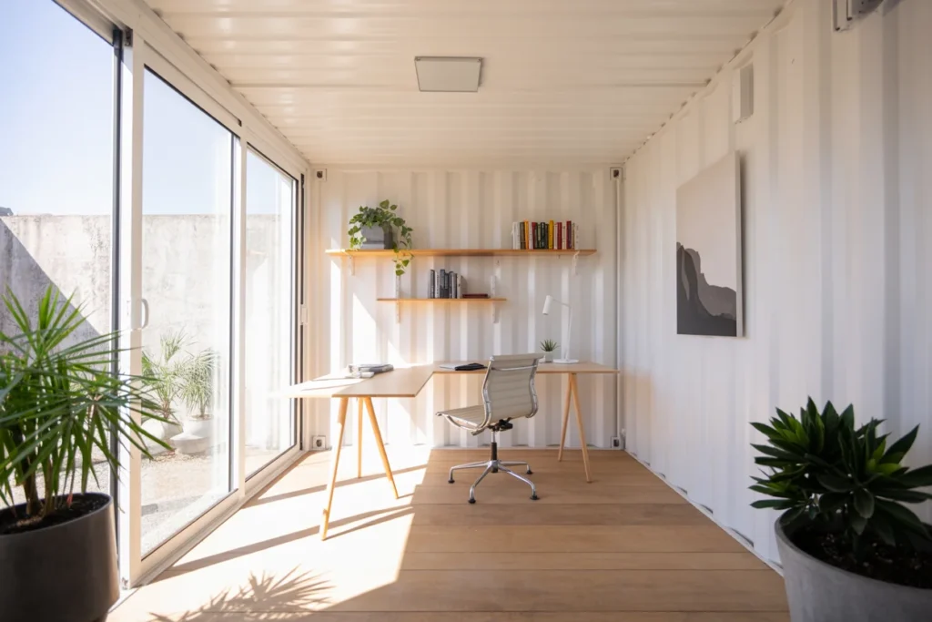 Bringing nature into a container office can improve mood and productivity. Wooden furniture, indoor plants, and earthy tones help create a refreshing and relaxing workspace.