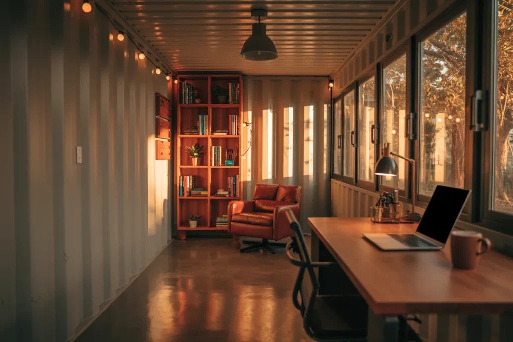 Adding a loft inside a container can create a multi-level workspace. The lower area can function as the main office, while the upper loft can serve as a reading or brainstorming zone.