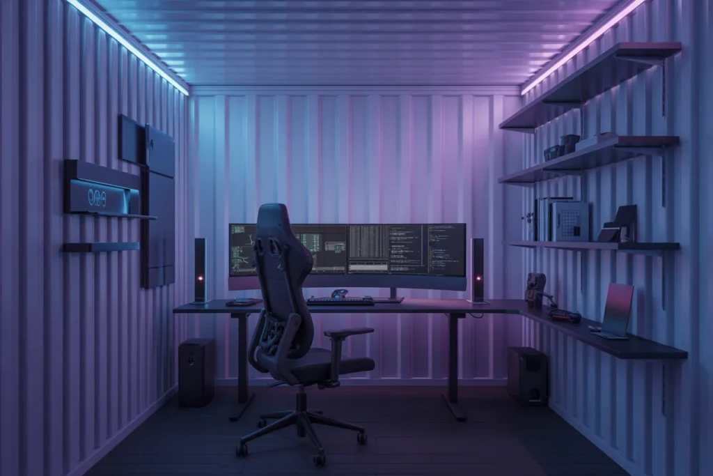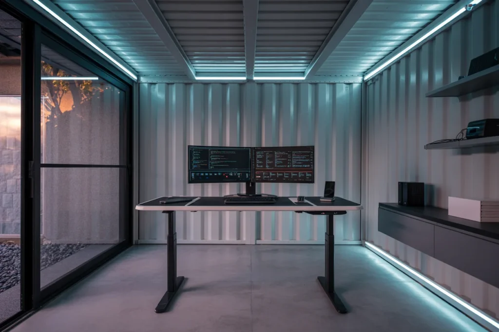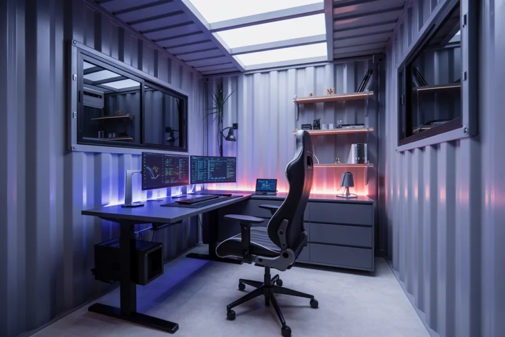 A smart container office integrates modern technology for maximum efficiency. Hidden cable management, smart lighting, and multiple monitor setups create a highly functional workspace.