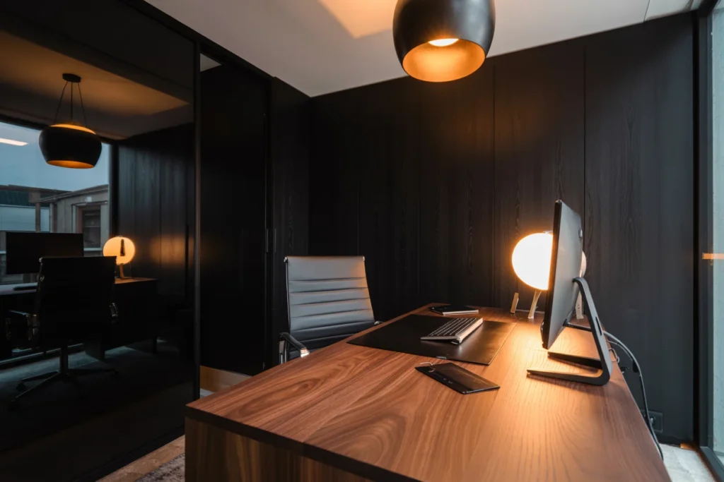 Smart desks and adjustable lighting can improve comfort and productivity. This design is perfect for professionals who rely heavily on digital tools and modern equipment.