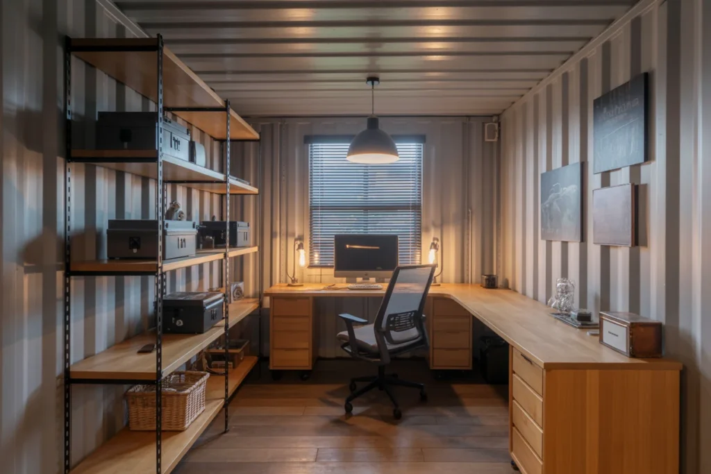 Adding floating shelves above the desk provides additional storage without occupying floor space. With smart furniture placement, even a small container can become a fully functional office.