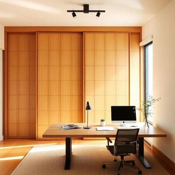Sliding panels or wooden room dividers help create a dedicated workspace. These elements are inspired by traditional Japanese interior design.