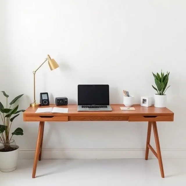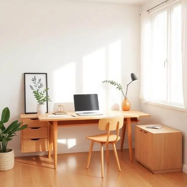 Choose a desk with simple lines and avoid heavy decorations to maintain a clutter-free environment. A calm workspace with minimal furniture helps improve focus and productivity.