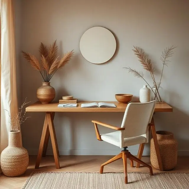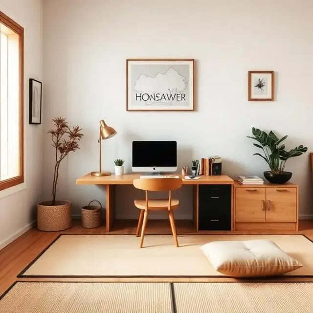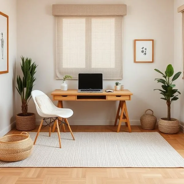 Soft rugs or cushions can add warmth to a Japandi office. Neutral-toned textiles create comfort while maintaining the clean design.