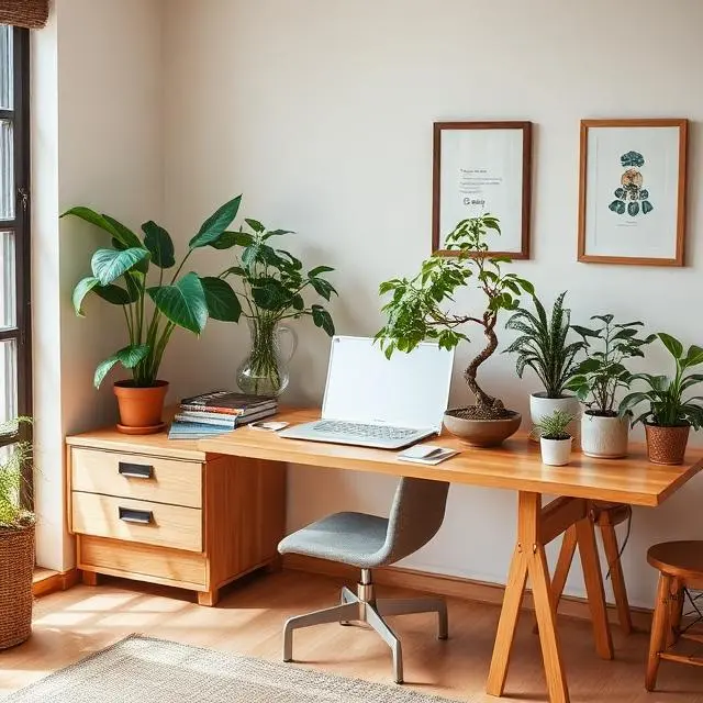 Adding a few indoor plants brings life and freshness into a Japandi home office. Plants help create a natural connection with the outdoors and soften the minimalist interior.