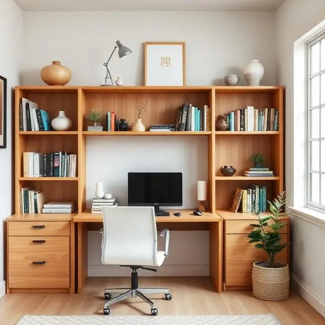 Open wooden shelves provide both storage and decoration in a Japandi office. They keep essential items organized while maintaining a light and airy appearance.