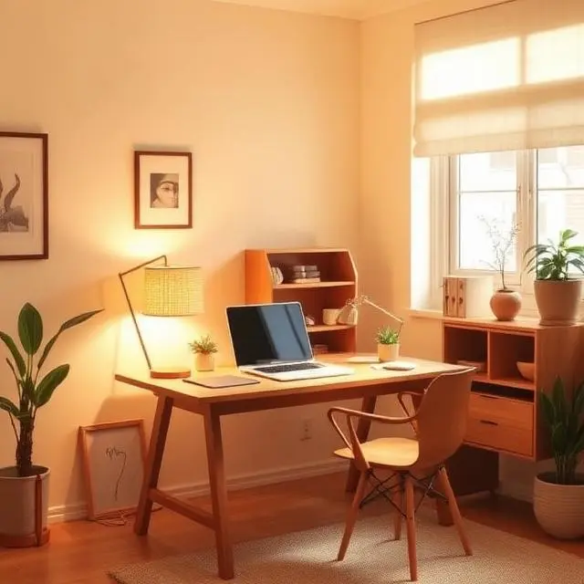 Soft lighting helps create a relaxing workspace during evening hours. Warm light from simple lamps adds comfort without disturbing the minimal aesthetic.