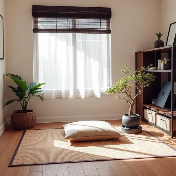 Creating a small relaxation corner can improve balance in a Japandi home office. A simple chair, plant, or meditation cushion can create a peaceful break space.