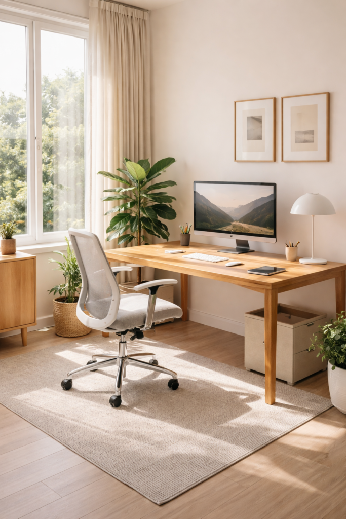 Position your desk near a window whenever possible. Natural daylight improves mood, reduces fatigue, and makes the workspace feel more inviting.