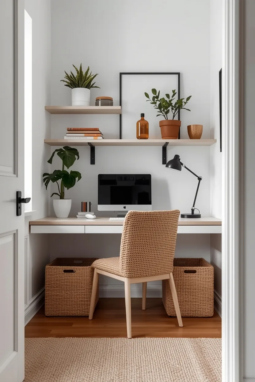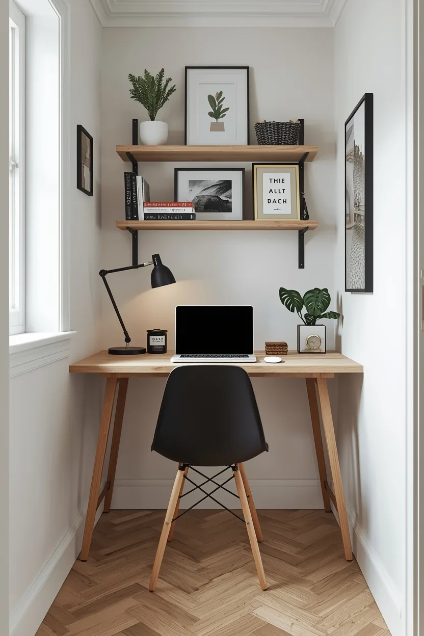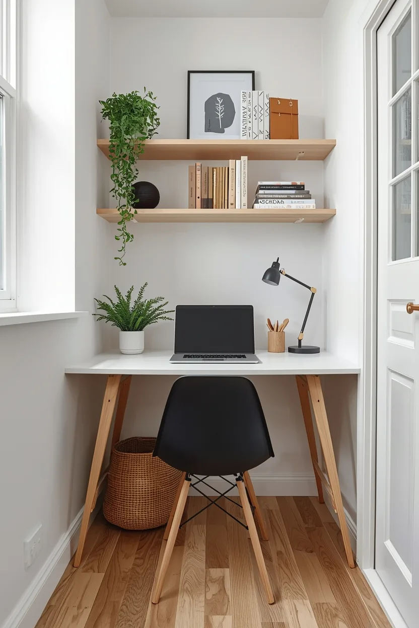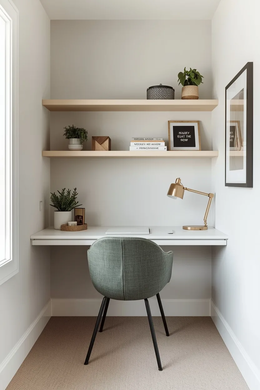 A floating desk is perfect for small spaces because it takes up minimal floor area while providing a clean, modern look. Pair it with wall-mounted shelves above for books, décor, or office supplies. This setup keeps your workspace organized while creating a visually airy environment.