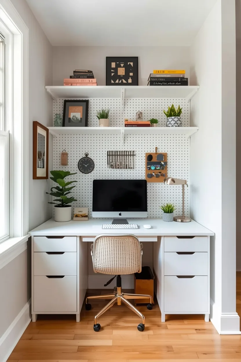 Use baskets, hooks, and small containers on the pegboard for easy organization. Light-colored walls and desk surfaces help reflect light and make the space feel larger, especially in a compact living room. Personalize the area with inspirational quotes or small artworks to create a motivating environment that still feels like part of your living room.