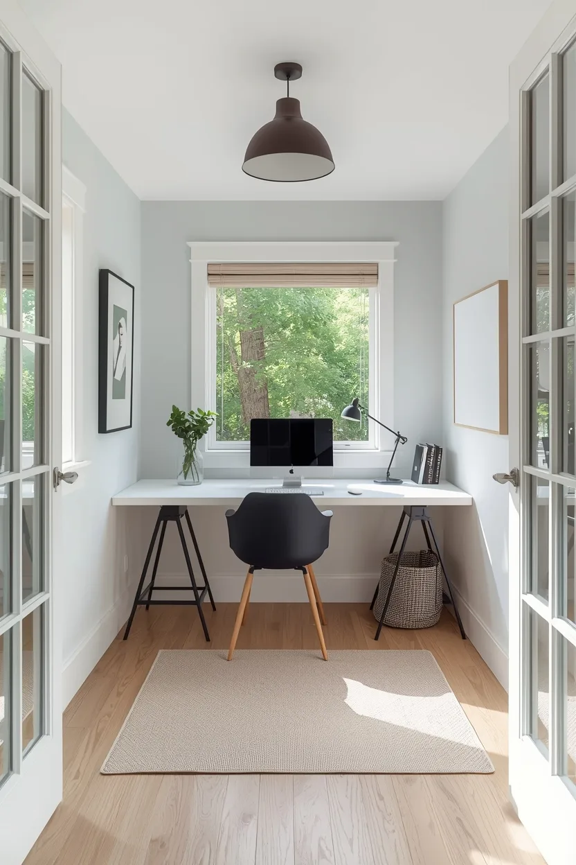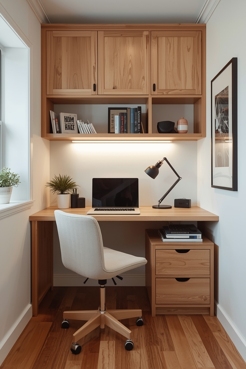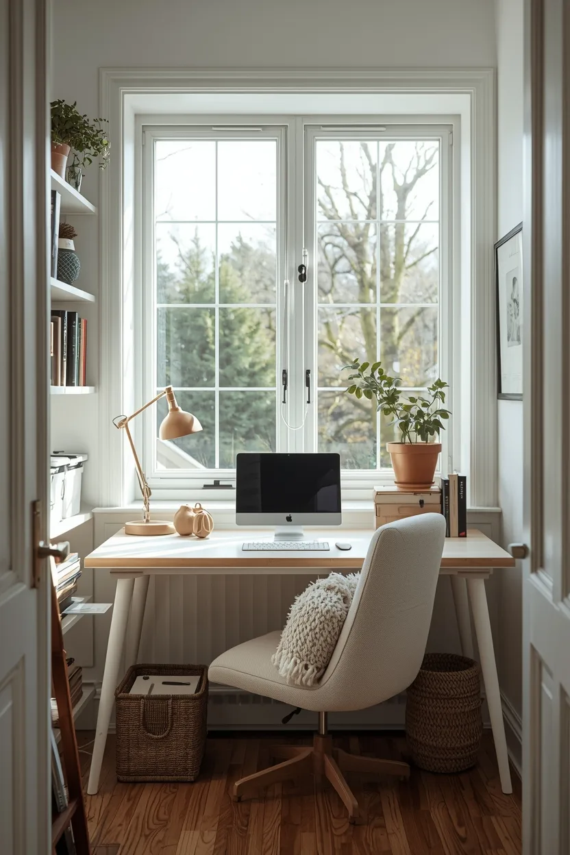 Add a few shelves above the window or small storage solutions underneath the desk. Keep décor minimal to maintain a sense of openness. A simple chair and a desk lamp complete this bright and airy tiny office setup.