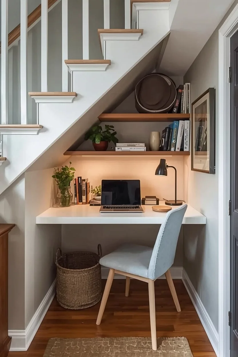 If your home has a staircase, consider creating a workspace underneath it. This hidden nook is ideal for a tiny home office, as it transforms unused space into a productive area. Adding shelves above the desk utilizes vertical space efficiently.
